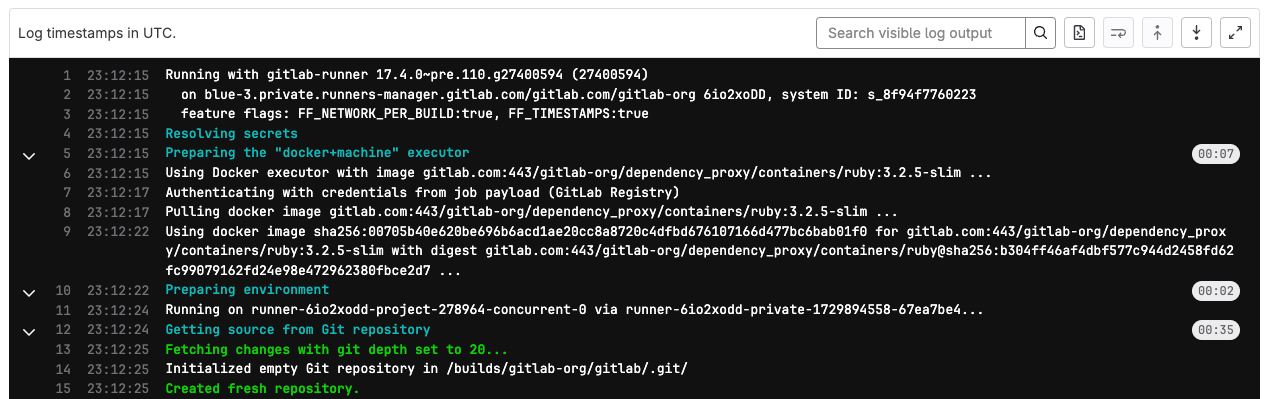 You can generate a timestamp in the ISO 8601 format for each line in a CI/CD job log. With job log timestamps, you can identify the duration of a specific section in the job. By default, job logs do not include a timestamp for each log line.