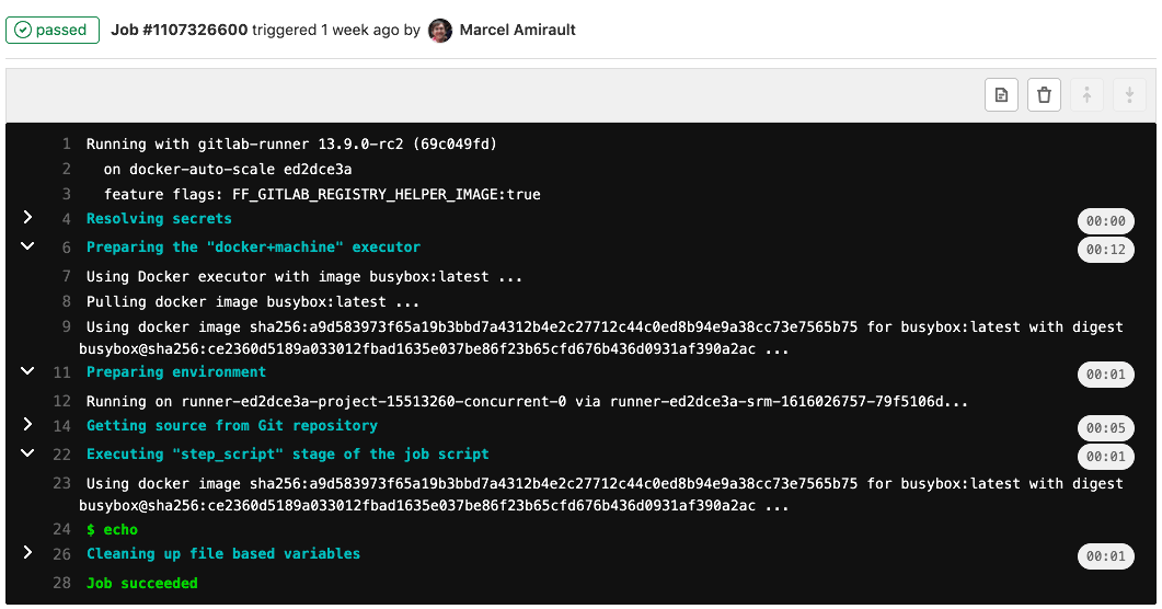 • Section end marker (unchanged): \e[0Ksection_end:UNIX_TIMESTAMP:SECTION_NAME\r\e[0K