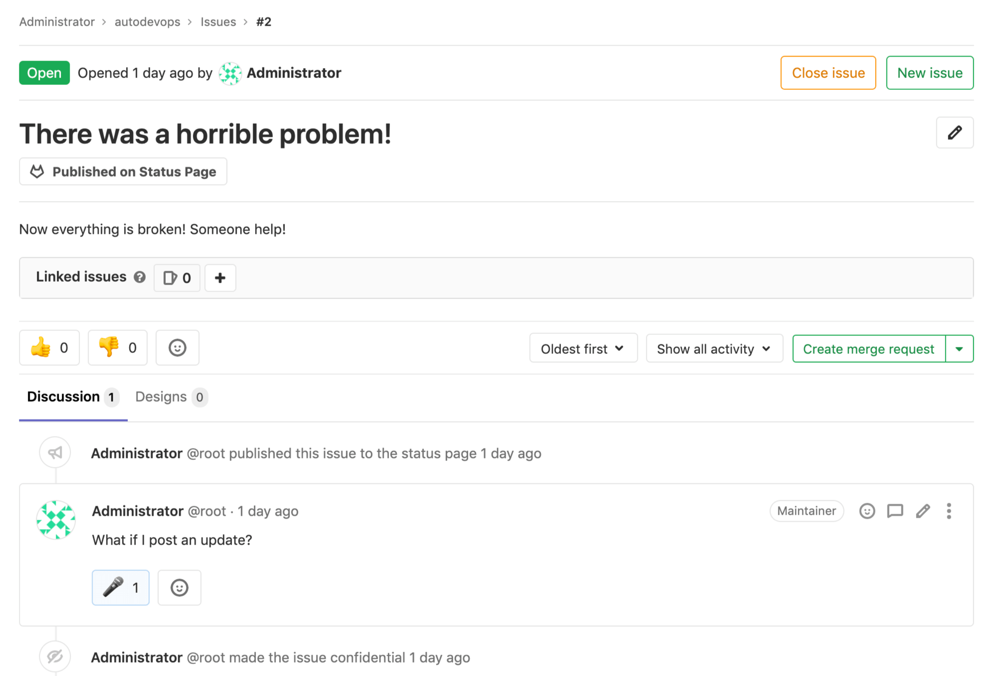 /publishquick action to publish the incident to the GitLab Status Page. Confidential incidents can't be published.